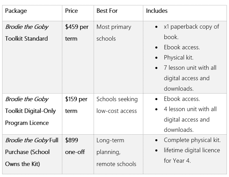 Wild Web Education currently offers a single, flagship product: the Brodie the Goby Toolkit. It is a comprehensive, curriculum aligned teaching resource designed to support biological science education while embedding general capabilities such as literacy, numeracy, and ICT. This resource kit is designed for years 3-5.